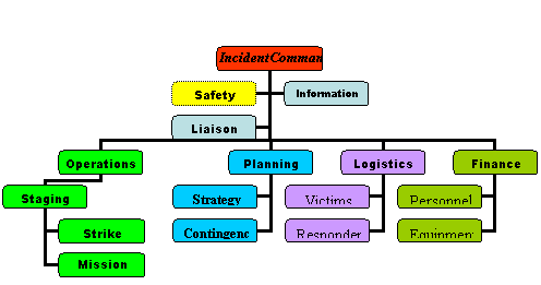 Operations: Sets up staging areas to assemble response assets and coordinate personnel when the IC requests a “strike” or “mission” operation. For example, a SWAT team might have to strike first to stop a sniper, followed by firemen, EMTs, and transporters on a mission to rescue the injured, followed by engineers and contractors to rebuild the area.